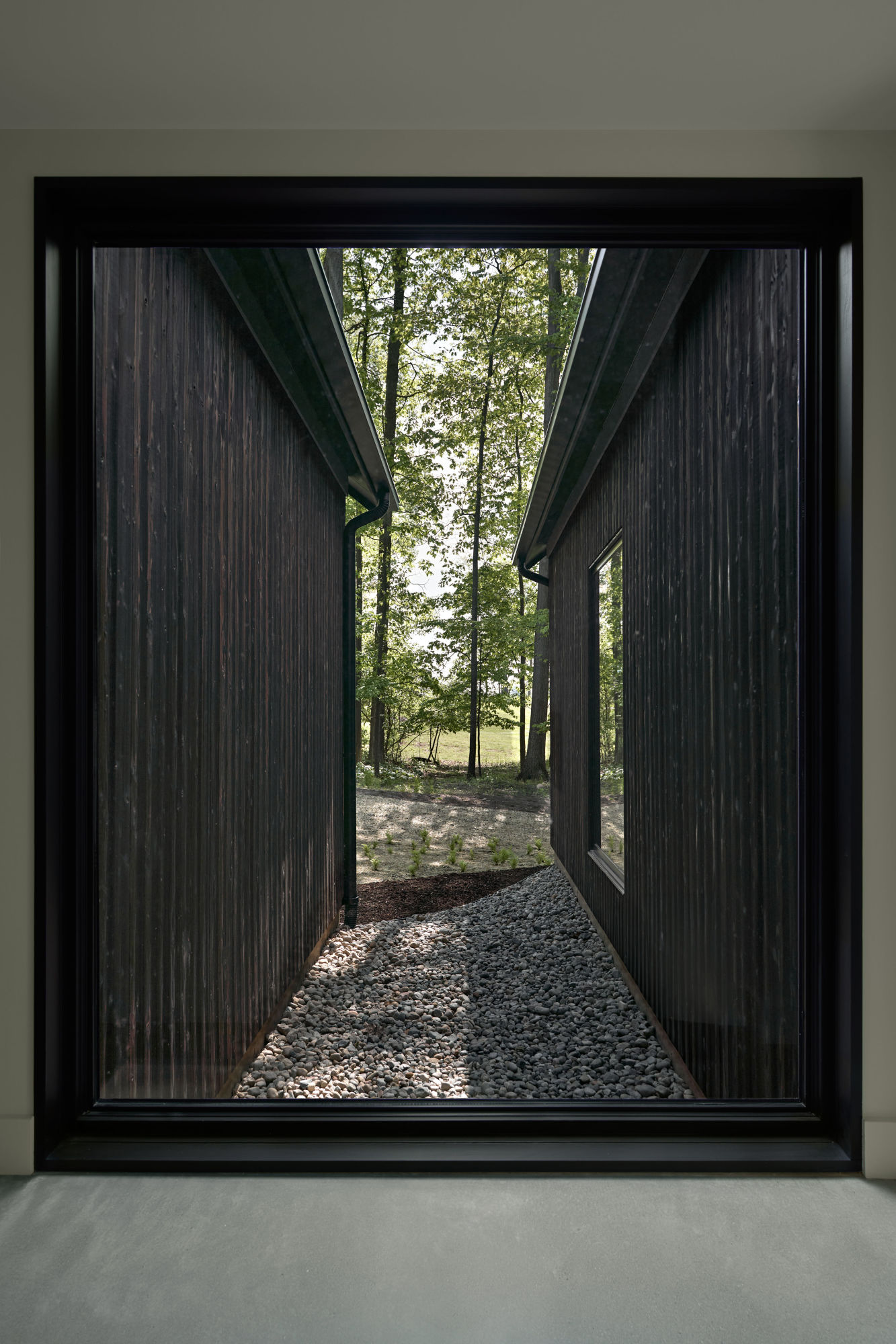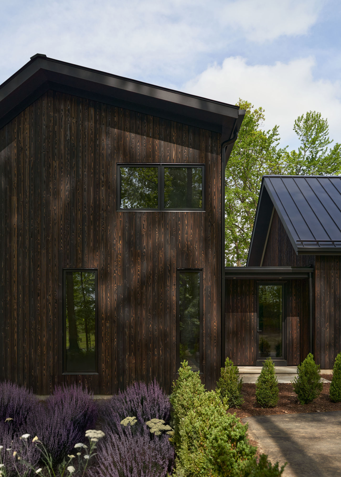 The Baw Beese Lake house was thoughtfully constructed to minimize its environmental impact. The home is heated by hydronic radiant heat – which eliminates the need for gas furnaces – and utilizes a unique high-performance insulation made from sheep’s wool for temperature and moisture control without toxic materials. High-performance windows, shou sugi ban siding, and a steel roof contribute to an impressive aesthetic while reducing maintenance requirements.”