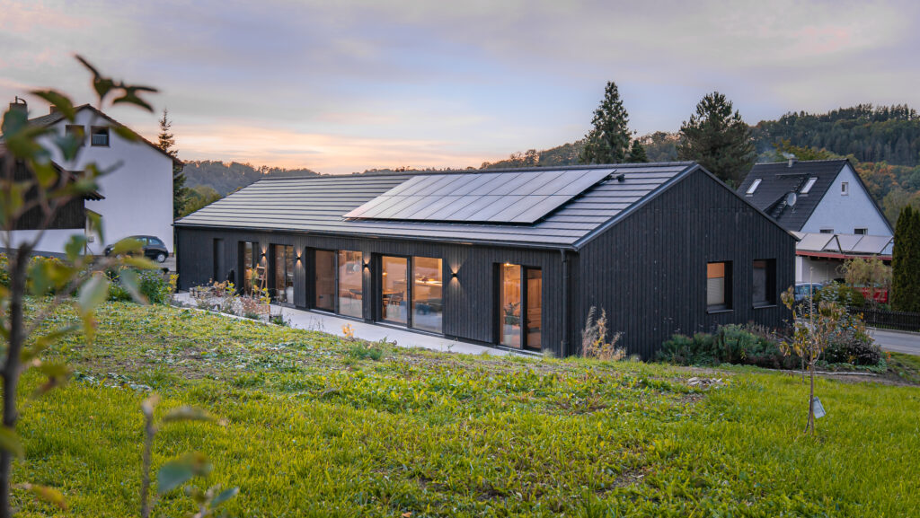 This project is a sustainable construction in the form of a bungalow with a pointed roof. The entire house consists of one floor. In combination with large window fronts that allow a view of the surrounding valley, a clear, minimalist design is created.
